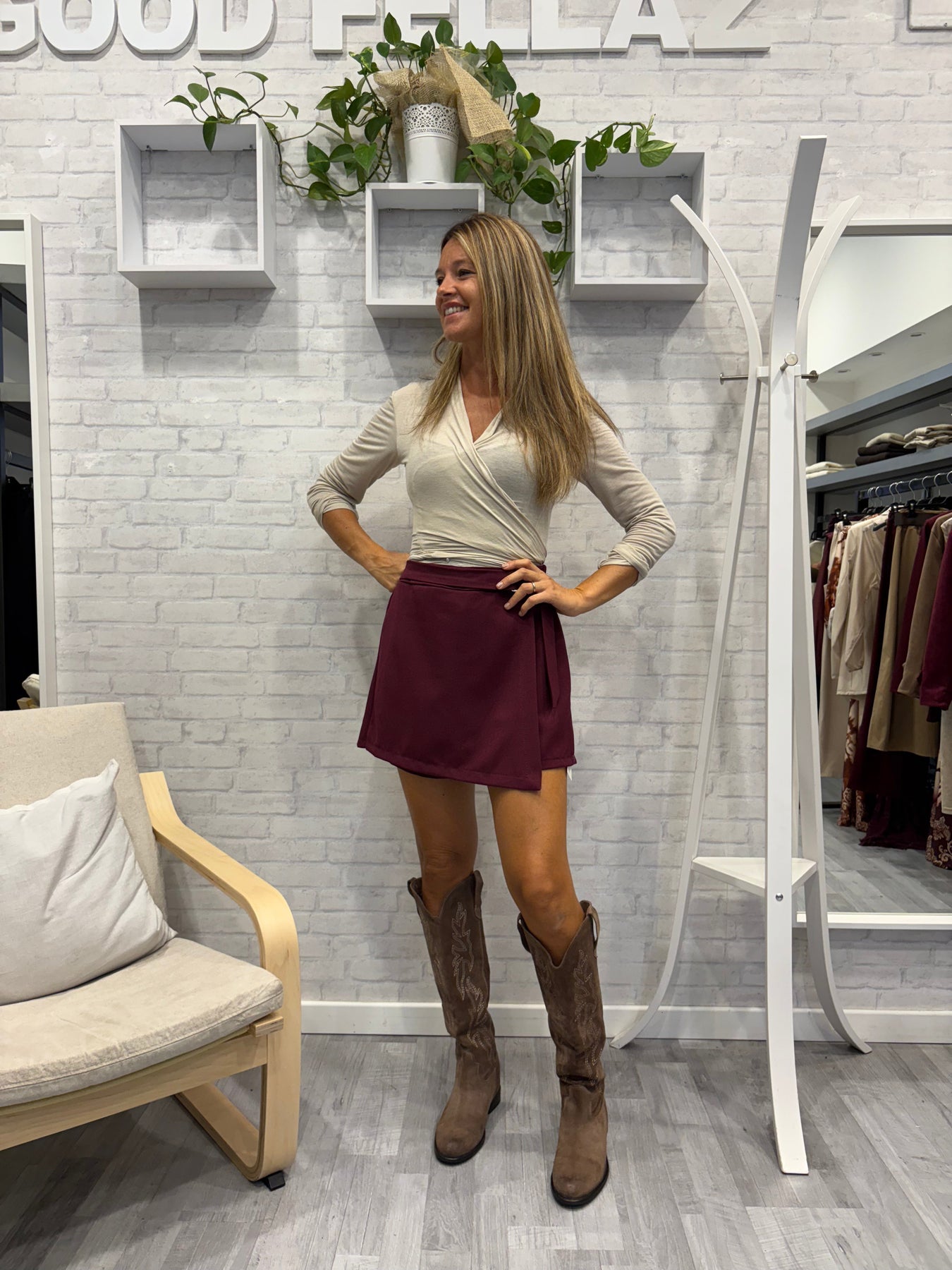 Il design avvolgente con chiusura laterale offre una vestibilità comoda e personalizzabile, mentre il colore neutro la rende facile da abbinare a top e accessori di ogni tipo. Indossala con stivali per un look audace o con sandali per un outfit estivo chic.