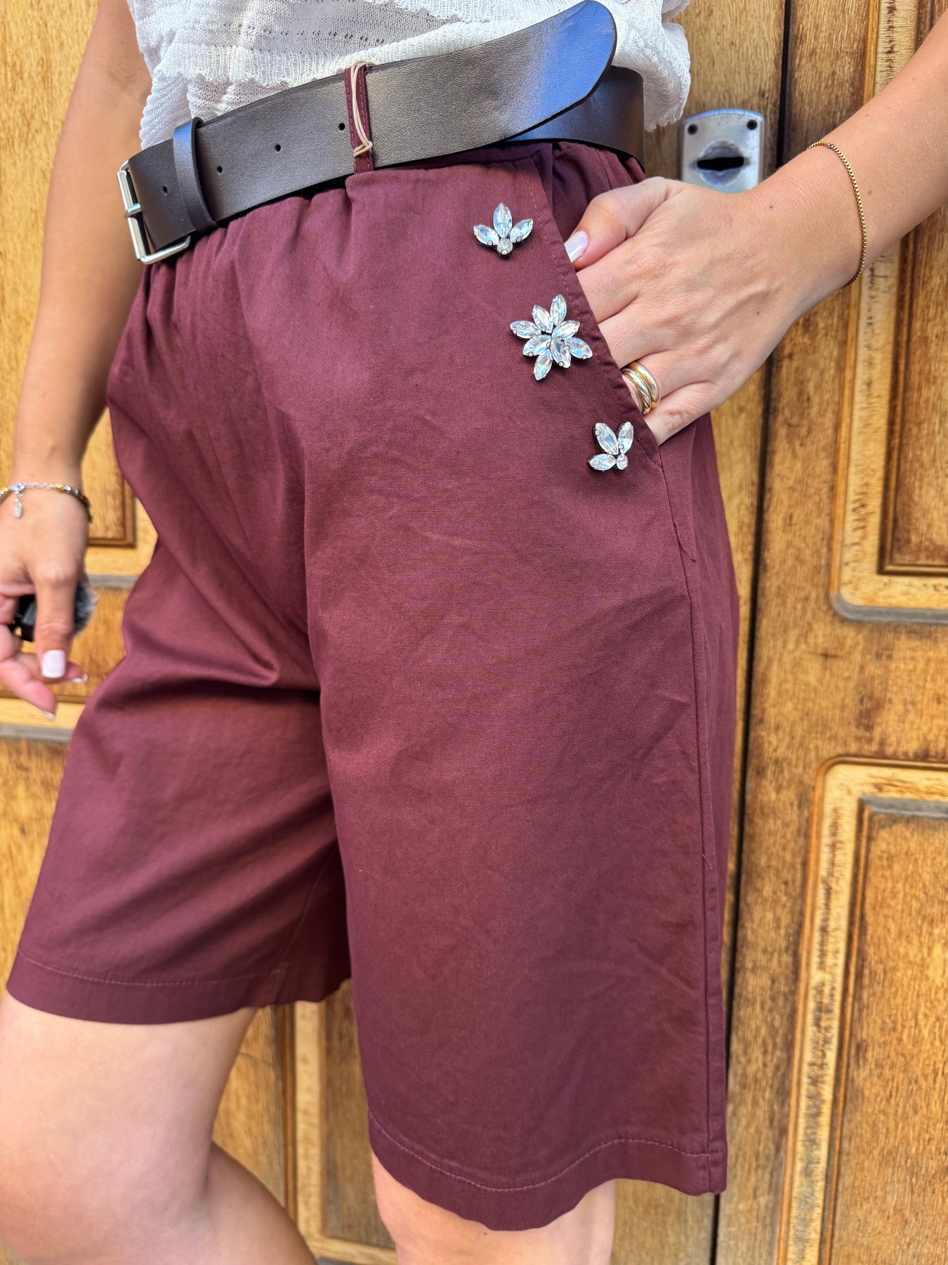 Pantaloncino in cotone con elastico in vita e applicazioni di strass