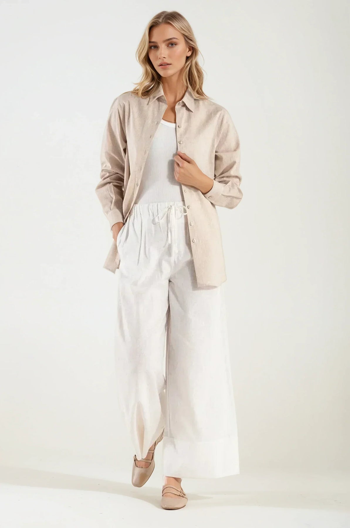 Il taglio ampio e il tessuto fresco lo rendono ideale per affrontare le giornate più calde con naturalezza. Il laccio in vita aggiunge un tocco funzionale e femminile, per un look curato e comodo in ogni contesto.